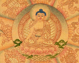 In essence, the depiction of Shakyamuni Buddha within the Mandala of a Thangka painting represents the pinnacle of enlightenment and serves as a focal point for meditation and devotion. The use of 24K pure gold further enhances the painting's spiritual potency, reminding practitioners of Shakyamuni's enlightened presence and inspiring them to cultivate wisdom, compassion, and inner peace in their own lives.