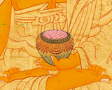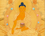 Full 24k gold fashion The magnificent Shakyamuni Buddha Thangka is a representation of the Buddha who founded Buddhism. With a background of gleaming 24k gold leaf, this traditional Tibetan Buddhist painting is painstakingly hand-painted in vivid hues and minute details. The thangka's central picture is Shakyamuni Buddha, who is surrounded by motifs and symbols that stand for his teachings and the road to enlightenment. The painting's rich intricacies and use of gold leaf give it a sense of grandeur and reverence that makes it an effective instrument for spiritual practice and meditation. One is said to be able to connect with the Buddha's teachings and achieve inner calm and enlightenment by gazing upon a Shakyamuni Buddha Thangka.