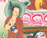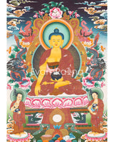 In the Thangka, Shakyamuni Buddha is depicted seated on a lotus throne in the posture of meditation, known as the Dhyana Mudra, symbolizing his attainment of enlightenment. Surrounding him are two disciples, often portrayed in respectful postures or engaged in acts of devotion. These disciples symbolize the transmission of Buddha's teachings and the continuation of his legacy by his followers.