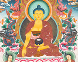 The Thangka portrays Siddhartha Gautama, known as Shakyamuni Buddha, the founder of Buddhism. Shakyamuni Buddha lived in ancient India around the 6th century BCE and is revered as the historical Buddha who attained enlightenment under the Bodhi tree in Bodh Gaya. He dedicated his life to teaching the Four Noble Truths and the Eightfold Path, guiding followers towards liberation from suffering.
