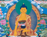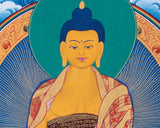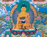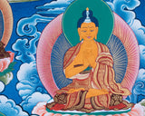 This unique Thangka painting, rendered in the vibrant Menri style, exquisitely depicts the Buddhas of the past, present, and future. The use of bright, beautiful colors brings each Buddha to life, making the artwork not only a visual delight but also a deeply spiritual experience. The Buddhas represented—Dipankara of the past, Shakyamuni of the present, and Maitreya of the future—symbolize the timeless continuum of enlightenment and the ongoing journey towards spiritual awakening. Each figure is intricately detailed, capturing the essence of their respective eras and teachings. The Menri style, known for its rich color palette and intricate designs, enhances the overall impact of the Thangka, making it a remarkable piece of Buddhist art.