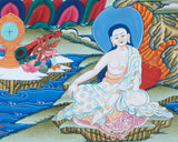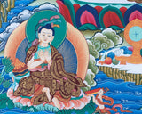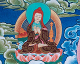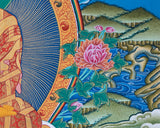 Surrounding these central figures are the Three Maha-siddhas and other great Buddhist teachers, whose presence further enriches the painting’s spiritual significance. These enlightened beings are venerated for their extraordinary spiritual attainments and their role in disseminating the teachings of the Buddhas. Their inclusion in the Thangka signifies the transmission of wisdom across generations and the enduring legacy of Buddhist teachings. This uncommon piece of art is not only a valuable addition to any altar, serving as a focal point for meditation and devotion, but also a thoughtful gift for loved ones. It encapsulates the essence of Buddhist philosophy and the profound journey towards enlightenment, making it a cherished item for both practitioners and art enthusiasts alike.