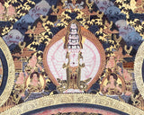 What sets this thangka apart is its exceptional level of detail and the use of real gold, enhancing its beauty and sacredness. Each intricate brushstroke and embellishment reflects the dedication of the artist and the profound spiritual significance imbued within every aspect of the artwork. As a testament to the highest standards of Tibetan artistic tradition, this thangka serves not only as a visual masterpiece but also as a powerful tool for meditation, contemplation, and spiritual transformation.