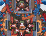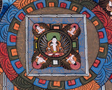 A round mandala thangka painting is a beautiful work of art. A self mandala, a depiction of the unconscious, allows one to recognize emotional issues and strive toward personality wholeness. Mandala is viewed as a location apart and sheltered from the impure and ever-changing outer world of samsara. A haven of calm and bliss.