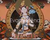 The exquisite hand-painted White Tara Thangka portrays the venerated White Tara in Tibetan Buddhism. The holy characteristics of compassion, wisdom, and protection personified by White Tara are beautifully captured in this finely made work of art. The Thangka, painted by accomplished painters using conventional methods, emits a sense of grace and tranquillity. Inviting followers to connect with White Tara's blessings and achieve inner tranquility and spiritual enlightenment, acts as a visual aid for meditation. The Thangka is a compelling symbol of devotion and a source of inspiration for spiritual searchers due to its refined features and brilliant colors.