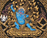 The name Vajrapani means the holder of the Vajra representing the power aspect of complete enlightenment. In the Sutra tradition of Mahayana Buddhism the Bodhisattva Vajrapani is portrayed in a peaceful appearance while in the Vajrayana tradition he is described in his most characteristic wrathful form and known as Guhyapati that means 'the Lord of Secrets' because he is considered as the main recipient and protector of all the sacred Tantra texts, literature, and teachings derived directly from Buddha Shakyamuni.