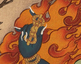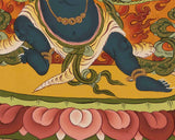 The name Vajrapani means the holder of the Vajra representing the power aspect of complete enlightenment. In the Sutra tradition of Mahayana Buddhism the Bodhisattva Vajrapani is portrayed in a peaceful appearance while in the Vajrayana tradition he is described in his most characteristic wrathful form and known as Guhyapati that means 'the Lord of Secrets' because he is considered as the main recipient and protector of all the sacred Tantra texts, literature, and teachings derived directly from Buddha Shakyamuni.