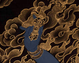 The embodiment of all the Buddhas' limitless strength, Vajrapani is the first meditational god in this series to be seen in a furious form. He is shown wielding a Diamond Scepter. He is standing and wearing a deep blue outfit made of tiger silk. He is holding a vajra in his right hand, which symbolizes the enlightened power of complete spiritual enlightenment, and his hands are in a commanding mudra, which is used to conquer barriers. His brow is adorned with a third eye of understanding, and flames of wisdom energy are emitted from every pore of his powerful body. The person who wields the Vajra, which stands for the power of complete enlightenment, is known as a Vajrapani.