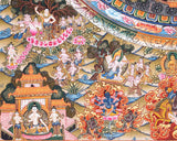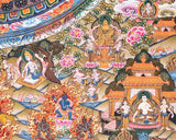 Throughout the thangka, the life story of Shakyamuni Buddha is masterfully portrayed, guiding viewers on a visual journey through his miraculous life and teachings. The presence of various other deities and Buddhas scattered around the mandala adds layers of spiritual depth and reverence, inviting contemplation and reflection upon the vastness of the enlightened realm.