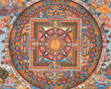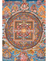 Adding to its richness, the bottom of the mandala features Palden Lhamo, a fierce protector deity, safeguarding against negative forces. The presence of four guardian kings at the corners further enhances the mandala's protective energy and spiritual significance.