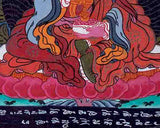 This vintage thangka is a masterpiece that weaves together the transcendent energies of Vajra, Vairocana Buddha, and Guru Rinpoche into a captivating portrayal of spiritual significance.