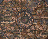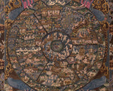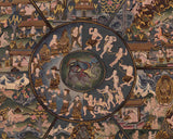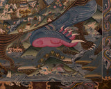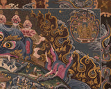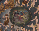 The "Wheel of Life," or Bhavachakra, is a Buddhist Thangka that illustrates the cycle of life, death, and rebirth. It represents the three poisons—ignorance, attachment, and aversion—that drive the cycle of suffering and rebirth. Six realms of existence surround the wheel, each with different states of suffering and happiness based on karma. The outer rim shows the Twelve Links of Dependent Origination, explaining how ignorance leads to rebirth and suffering. Yama, the Lord of Death, holds the wheel, symbolizing the inevitability of death and the transient nature of life. Above the wheel, the Buddha points to the moon, symbolizing liberation and enlightenment. The Thangka serves as both a teaching tool and a meditation aid. In "The Wheel of Life: Journey Through Samsara," Thangka illustrates the cycle of existence and highlights the path to breaking free through enlightenment.