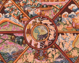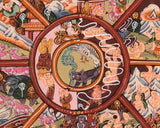 The Wheel of Life, or “Bhavacakra,” is well known by Buddhist monks as a powerful meditation tool and by students to learn and understand the teachings of the Buddha. The Wheel represents the very reasons for suffering, and it can be seen painted on the walls of many Tibetan Buddhist monasteries in all Himalayan regions. The center circle illustrates “the three poisons,” represented by a cock (ignorance), a pig (greed), and a snake (hatred). They are surrounded by the six realms of existence, which are surrounded by the perpetual cycle of life, or samsara of the wheel.