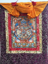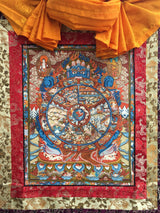 Our Original Hand-Painted Wheel of Life Thangka is a unique and authentic Tibetan Buddhist painting framed with premium silk brocade that visually depicts the Wheel of Life, a symbolic representation of the cycle of existence. Meticulously hand-painted, this thangka likely showcases intricate details and vibrant colors, capturing the essence of the traditional art form. The Wheel of Life, also known as the Bhavachakra, is a complex and symbolic illustration illustrating the cycle of birth, life, death, and rebirth within the realms of samsara. The wheel is divided into various sections, each representing different aspects of human experience, karma, and the path to liberation. The outer rim often depicts the Twelve Links of Dependent Origination, while the hub contains the three poisons (ignorance, attachment, and aversion). The significance of the Wheel of Life lies in its teachings on impermanence, suffering, and the opportunity for liberation through the understanding and transcendence of cyclic existence.