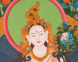 Our Thangka is created using traditional methods and strictly following to the proportions of deities as they are laid down in Buddhist scripture. The colors are natural, Acrylic Colors and adorned with 24k gold paint. Each piece is witness to a unique tradition that remains intact. White Tara Deity is in the center, surrounded Medicine Budhha & Shakyamuni
