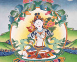 White Tara (Skt. Sita Tara) is also known as Saptalocana Tara, the 'Seven-eyed Saviors', and Amitayus and Ushnishavijaya. She appears as one of the three principal Buddhist deities of longevity. Her meditational practices are mainly employed to confer long life, alleviate illnesses, and remove the obstacles that are indicative of an untimely death. Thangkas of White Tara and the 'Trinity of Long-Life Deities' are frequently commissioned for such purposes and also to auger an auspicious rebirth for a deceased relative or friend.