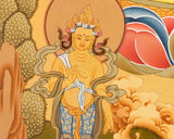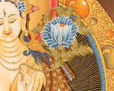White Tara is seated on a lotus throne in the middle of the thangka with her right leg extended and her left leg drawn in. She has seven eyes, the third of which is located on her forehead and represents her fully awakened consciousness. Her left hand is holding a white lotus flower, a symbol of her purity and enlightenment, while her right hand is outstretched in a gesture of generosity.