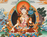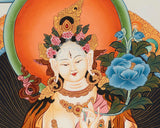 White Tara (Skt. Sita Tara) is also known as Saptalocana Tara, the 'Seven-eyed Saviors', and along with Amitayus and Ushnishavijaya she appears as one of the three principal Buddhist deities of longevity. Her meditational practices are mainly employed to confer long-life, alleviate illnesses, and to remove the obstacles that are indicative of an untimely death. Thangkas of White Tara and the 'Trinity of Long-Life Deities' are frequently commissioned for such purposes, and also to auger an auspicious rebirth for a deceased relative or friend.