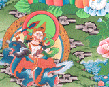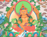 The 5 Dzambhala Thangka Painting represents a profound manifestation of prosperity and abundance in Tibetan Buddhist iconography. The painting depicts one of the five Dzambhalas, revered as guardians of wealth and fortune. With richly adorned figures seated upon lotus thrones, the Dzambhalas emanate a sense of regal power and benevolent grace. Their gestures symbolize generosity and the granting of wishes, while their radiant forms exude a sense of opulence and magnificence. As guardians of the northern direction and the treasures it holds, the Dzambhalas are believed to bestow material wealth, financial stability, and abundance upon devotees who venerate them with sincerity and devotion. The 5 Dzambhala Thangka Painting serves not only as a visual feast for the eyes but also as a potent conduit for invoking blessings of prosperity and success into the lives of those who adorn their spaces with these sacred images.