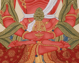 Transform your spiritual space with the Amitayus, Buddha of Infinite Life, an artwork that embodies longevity, wisdom, and boundless compassion. He is shown seated on a lotus base, symbolizing his purity and his ability to grant eternal blessings to his devotees; his red form symbolizes life's vitality and energy. This stunning thangka preserves the rich heritage of Tibetan art, meticulously hand-painted on premium cotton canvas. Vibrant acrylics enhance its dimensionality and intricate details, while genuine 24K gold imparts a sacred luminosity, signifying wisdom and enlightenment.