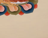 His serene face radiates calm and compassion, while his red body represents the vitality and life force of all sentient beings. He holds a kalasha (a vase of nectar) in his hands, symbolizing the healing potion of immortality and the blessings of long life. His heavenly essence is reflected in his jewel-encrusted crown and ornaments, as well as in his robes adorned with exquisite patterns. The radiating halo behind his head is a prominent motif in Buddhist paintings, signifying his enlightened nature and divine wisdom. Its gentle yellowish background, representing serenity, coziness, and spiritual illumination, contrasts beautifully with the Buddha's more vivid hues. It serves as an excellent addition to meditation rooms, altars, or sacred spaces, reminding us of infinite life and wisdom.
