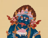 The Black Kubera Thangka portrays the fierce protector of prosperity, a powerful incarnation of Dzambhala revered for his ability to bestow wealth, eliminate financial barriers, and provide abundance. He is shown in an aggressive stance, with striking blue skin that signifies his strength in overcoming difficulties and negativity. His bright hair, bulging eyes, and intense expression emphasize his wrathful nature, which aims to drive away any obstacles to prosperity and success. Carefully hand-painted on high-quality cotton canvas, this exquisite thangka maintains the rich traditions of Tibetan artistry. Authentic 24K gold lends a celestial brightness that symbolizes wisdom and enlightenment, while vibrant acrylic colors enhance its depth and intricate details.