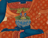 Beautifully portrayed in the Blue Healing Buddha Thangka, Bhaisajyaguru, also known as the Medicine Buddha, is renowned for his ability to cure spiritual and physical illnesses. He has a deep blue body, representing the light of lapis lazuli - a color that symbolizes purity, healing energy, and boundless compassion. Positioned in a vajra pose on a vibrant pink lotus base, he holds a healing bowl filled with nectar in his left hand, resting on his lap. In his right hand, he extends a branch of the Myrobalan plant, a sacred medicinal herb believed to cure all inner and outer ailments. It is meticulously painted on cotton canvas in the traditional Tibetan style, with its beauty and spiritual significance enhanced by the use of genuine 24K gold and acrylic colors.
