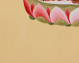 Symbolizing elegance, spiritual wealth, and compassionate energy, the Medicine Buddha's robes in this thangka are intricately patterned. The multicolored halo surrounding him signifies his awakened wisdom and the spiritual energy flowing from him, while the lotus base on which he sits represents purity and enlightenment. His quiet and serene expression radiates kindness and compassion, inspiring practitioners to trust in his therapeutic abilities. The gentle yellow background of the thangka conveys peace and tranquility, fostering a meditative setting that enhances the healing and restorative energy of the Buddha.