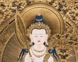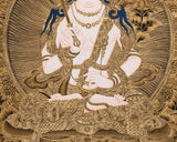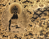 The gold detailing in the Thangka is where the true artistry shines. The intricate gold leaf embellishments on the robes, jewelry, and celestial backdrop create a radiant and luminous aura around Akasagarbha, imbuing the artwork with a sense of divine presence. The gold used is not only symbolic of the Buddha's purity but also enhances the spiritual significance of the painting. Gold in Tibetan art often represents the wisdom and light of the Buddhas, and in this Thangka, it highlights Akasagarbha’s role in dispelling darkness and ignorance, filling the canvas with a sense of sacred illumination.