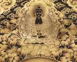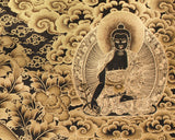 The gold detailing also extends to the other figures, including the surrounding Buddhas and Bodhisattvas. The precision of the gold accents, whether outlining the flowing robes of the figures, their ornaments, or the flames and clouds surrounding them, creates an effect of depth and movement that brings the entire piece to life. The luminous quality of the gold accents contrasts beautifully with the deep black canvas, emphasizing the divine figures and adding a profound sense of sacredness to the artwork.