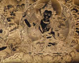 At the top of the painting, you can find the esteemed Buddha Shakyamuni, Amitabha Buddha, and Medicine Buddha, each depicted with their distinctive qualities and wisdom, completing the celestial assembly. These Buddhas symbolize enlightenment, compassion, and healing, which add profound depth to the composition. The lower section of the Thangka features the powerful figures of Chenrezig (Avalokiteshvara), Dzambhala, and Manjushri, each embodying different aspects of wisdom, wealth, and compassion. These divine beings are illustrated with their iconic attributes, reinforcing the Thangka’s theme of spiritual prosperity and protection.