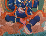 Mahakala is depicted with one face and three red eyes, representing fierce insight. His gaping red mouth, orange beard, and upward-flowing orange hair symbolize his fiery energy and destructive power. The artist has carefully rendered the deity’s main pair of hands, with the right holding a curved knife and the left a blood-filled white skullcup. His second pair of hands holds a vajra-handled sword in the right and a katvanga staff with a trident tip in the left. Adorned with a crown of five white skulls, earrings, and bracelets, Mahakala’s attire represents both wisdom and power.