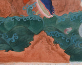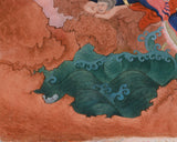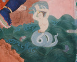 Surrounded by flames, the fires of pristine awareness, the piece conveys the purifying energy of Mahakala. The lower body, wrapped in a tiger skin skirt, and the right leg pendant reflect his dominion over ignorance and illusion. The serpent deity, emerging from the waters at the bottom of the composition, is shown offering veneration to Mahakala, symbolizing the harmony between the elemental forces and spiritual protection.