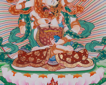 This beautiful Dorje Sempa with Consort Thangka is hand-painted on fine cotton canvas using vibrant acrylic colors and accented with genuine 24K gold. Created with care by a talented Nepali artist in a traditional style, it showcases remarkable workmanship and attention to detail. The bright acrylic colors make the artwork lively, and the 24K gold accents add a divine glow to the deities, making this painting not only visually appealing but also spiritually meaningful.