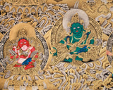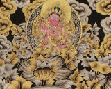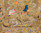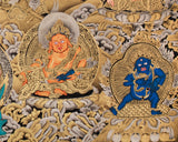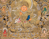 Witness the majestic might of Vaishravana, the Guardian of the North, in this exclusive Thangka skillfully rendered in gold on a black canvas. This stunning piece measures 21" wide by 30" high, creating a commanding presence that transforms any space into a realm of divine protection and abundance. Every inch of this Thangka is embellished with intricate gold details, capturing the celestial splendor of Vaishravana’s armor and the swirling motifs of the surrounding deities. The dramatic black background enhances the brilliance of the gold accents, infusing the artwork with an ethereal radiance.