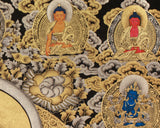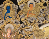 At the pinnacle of the composition, an assembly of Buddhas radiates blessings, while Taras and Bodhisattvas flank Vaishravana, reinforcing the harmonious balance of wisdom, compassion, and protection. Adjacent to the lotus base, Amitayus and Namgyalma embody longevity and the removal of obstacles. In the lower register, the five forms of Dzambhala, Red, Green, White, Yellow, and Black, offer wealth and prosperity, reflecting the Thangka’s overarching themes of spiritual and material well-being.