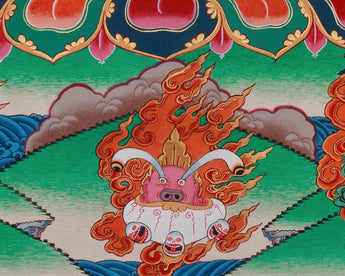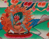 In this thangka, Yamantaka is depicted with multiple heads, 32 arms, and 16 legs, each rendered to embody his omniscient presence and unstoppable force. The central buffalo face snarls with flaming wrath, while above it rises the serene countenance of Manjushri, signifying ultimate wisdom behind the fury. He stands triumphantly upon a sun-disc lotus throne, trampling symbolic figures representing ego, hatred, desire, and death. His garland of severed heads and bone ornaments signifies the transformation of ignorance into transcendent awareness. Surrounding Yamantaka are complementary wrathful protectors, anchoring the thangka in a sacred cosmic field.