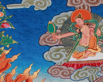 The background is richly painted with Tibetan landscapes, evoking both the terrestrial and transcendental realms in which Yamantaka operates. This rare and fierce thangka is ideal for advanced Vajrayana practitioners, tantric meditators, or collectors of sacred Buddhist art.