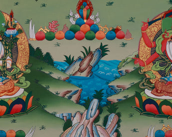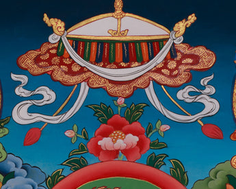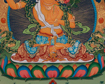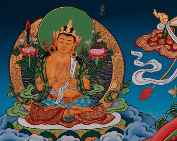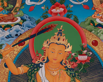 The Bodhisattvas of Wisdom are beautifully illustrated in this Five Manjushri Thangka, showcasing five unique forms, each symbolizing a specific aspect of ultimate understanding and enlightened compassion. This Thangka was hand-painted in the traditional style by a talented artisan. The artwork is made with acrylic colors, allowing for brilliant and precise detailing. Genuine 24K gold is expertly added to highlight the sacred aspects, giving the Thangka a beautiful, luminous look. The artwork is created on cotton canvas, which ensures durability and a smooth surface for delicate design work. These high-quality materials ensure the Thangka's longevity and spiritual presence, making it a meaningful and beautiful piece.