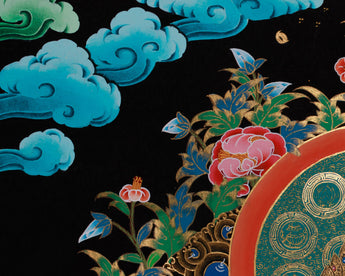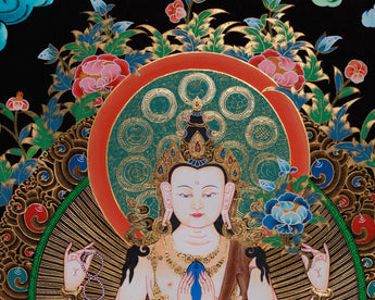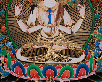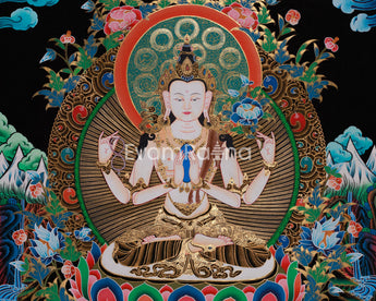 This magnificent Four-Armed Chenrezig Artwork depicts the Bodhisattva of Compassion, a renowned deity in Tibetan Buddhism. This thangka is delicately hand-painted in the traditional style by a skilled artist using high-quality materials to ensure long-lasting beauty and authenticity. Vibrant acrylic colors are meticulously added to the durable cotton canvas to highlight the image's depth and fine details. The painting's use of genuine 24K gold highlights essential components such as the lotus base and halo, which exude a celestial shine, and emphasizes the deity's revered presence. The thangka is a priceless and significant work of spiritual art due to the artist's skill and attention to detail, which contribute to its overall excellent quality.