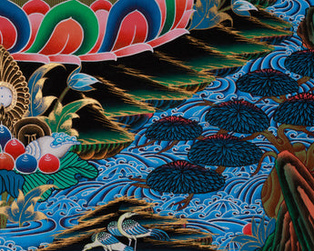 Chenrezig is depicted in a remarkably detailed design, with four arms that each make symbolic gestures of love, protection, and compassion. Sitting atop a finely detailed lotus base, which represents purity and enlightenment, the central image emphasizes the Bodhisattva's serene posture and calm expression. The richness of the sacred figure is highlighted by the vivid, detailed colors used to create this piece of art, and Chenrezig's celestial essence is emphasized by the glowing golden halo that surrounds him. The lotus petals are adorned with bright colors of pink, green, and red, intertwined with genuine 24K gold accents that enhance the artwork's exquisite quality. This thangka invites the spectator into a state of loving-kindness, mindfulness, and spiritual reflection, whether used for meditation, as an altar space, or as decorative inspiration.