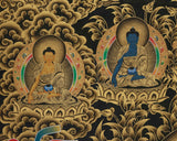 The characters in this thangka together highlight the Buddhist tradition's emphasis on the harmony and balance of wisdom, compassion, and direction. This thangka's luminous gold detailing and vivid colors of the Buddhas and surrounding characters contrast with the dark black canvas that serves as the background. The figures are surrounded by clouds and whirling patterns that symbolize the ethereal realm, which is frequently thought of as the home of enlightened beings. The background also includes flowing water and mountain ranges, which are typical Tibetan Buddhist art motifs. As a powerful visual aid for mindfulness, inner harmony, and divine inspiration, this Gold Thangka is ideal for meditation spaces, spiritual décor, or as a cherished gift.