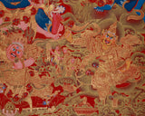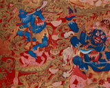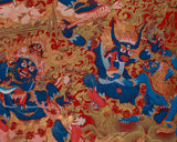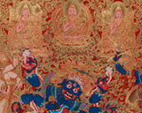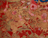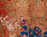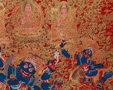 This thangka, beautifully adorned in gold and set against a deep red background, is a striking example of Tibetan Buddhist art. It conveys the powerful protective energy of Mahakala and the Dharmapala figures. With intricate details and golden accents, this thangka serves as a unique spiritual emblem and a premium symbol of devotion, representing the courage and strength needed to navigate the challenges on the path to spiritual enlightenment.