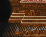 The set of flickering butter lamps at the front of the throne illuminates the sacred offering space with a warm glow, signifying the eradication of darkness and the illumination of wisdom. Every aspect of this Thangka has been rendered with meticulous detail, blending rich Paubha elements with an unparalleled sense of realism. A rare and remarkable work of art, this Thangka is perfect for meditation areas, individual shrines, or sacred collections due to its gold-on-black canvas combination. Its powerful presence guides practitioners toward enlightenment, wisdom, and inner calm by acting as a continual reminder of the Buddha's teachings.