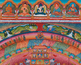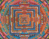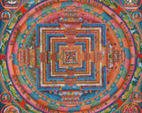 The mandala's intricate design consists of multiple concentric circles, representing different realms of existence, consciousness levels, and stages of spiritual awakening. At the center of this mandala, a deity or enlightened figure resides within a multi-layered palace structure, signifying the ultimate seat of wisdom, enlightenment, and spiritual awakening. Each layer of the square palace, adorned with ornate gateways and vibrant colors, represents a different stage of spiritual progression, guiding practitioners inward toward enlightenment. The mandala is surrounded by a group of Buddhas, protectors, and deities, which emphasizes the sacred artwork's spiritual value.