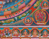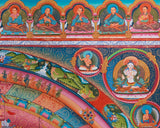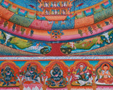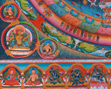 Various Buddhas, bodhisattvas, and enlightened masters are portrayed at the top and bottom borders, representing different facets of knowledge, kindness, and guidance on the path to enlightenment. These enlightened beings offer counsel to individuals seeking enlightenment and embody the many traits of wisdom, compassion, and divine protection. This mandala serves as a profound spiritual guide for self-discovery and personal growth, as each deity holds symbolic qualities that reflect numerous Vajrayana Buddhist teachings and practices. This Thangka is perfect for meditation, altar decoration, or as a meaningful gift for Buddhists.