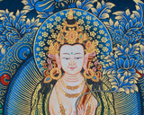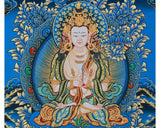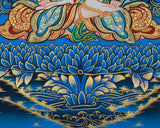 An elegant portrayal of Jnanasattva Manjushri, this thangka embodies the essence of wisdom and enlightenment. Following the traditional Tibetan style, it is meticulously painted on fine cotton canvas with acrylic colors and genuine 24K gold. The unique blue and gold background enhances the deity's divine presence, symbolizing the depth of spiritual illumination and knowledge. Every detail, from the flowing robes to the intricate embellishments, has been carefully crafted to achieve artistic perfection and spiritual authenticity. The contrast of golden motifs against the deep blue tones accentuates the divine aura of this painting, making it a visually striking and spiritually profound artwork.