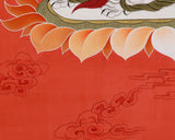 The flames emanating from his halo and the burning aura that envelop him highlight his association with the transformational and cleansing properties of fire, which have the power to eradicate ignorance and unfavorable feelings. His lavish attire and elaborate jewels convey his connection to material prosperity and luxury, which come from upholding the dharma. The clouds that encircle him refer to a transcendent, mystical aspect, which strengthens Namtose's reputation as a potent purifier and protector. This thangka's red background symbolizes his strong force and dynamic energy. It enhances the entire aura of energy and transformation by amplifying the deity's presence and power.
