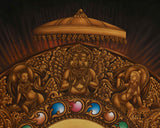 The throne where Shakyamuni is seated features intricate decorations, enhancing the scene's grandeur. Its backrest boasts rich embellishments with detailed illustrations of elephants, celestial beings, and mythological figures, highlighting the spiritual significance of the Buddha's enlightenment. In Buddhist art, these figures often carry symbolic meanings; for instance, elephants represent strength, stability, and wisdom. Additionally, the floral motifs supporting the throne symbolize purity and divine beauty, which are common in Buddhist symbolism, illustrating how enlightenment liberates one from earthly desires, leading to a state of beauty and purity.