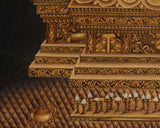 Situated delicately beneath the Buddha, the lights represent symbolic offerings that embody enlightenment's light, dispelling ignorance's darkness. A striking contrast of light and shadow is evident in the Buddhist artwork Shakyamuni Buddha Thangka, featuring a black backdrop adorned with gold details that impart a dazzling glow. The intricate 24K gold craftsmanship enhances the Buddha's wisdom and adds visual depth, showcasing elaborate throne, halo, and robe designs. Collectively, these artistic elements make the thangka a compelling representation of Shakyamuni Buddha's enlightenment and the ongoing relevance of the Buddha's teachings in the world.